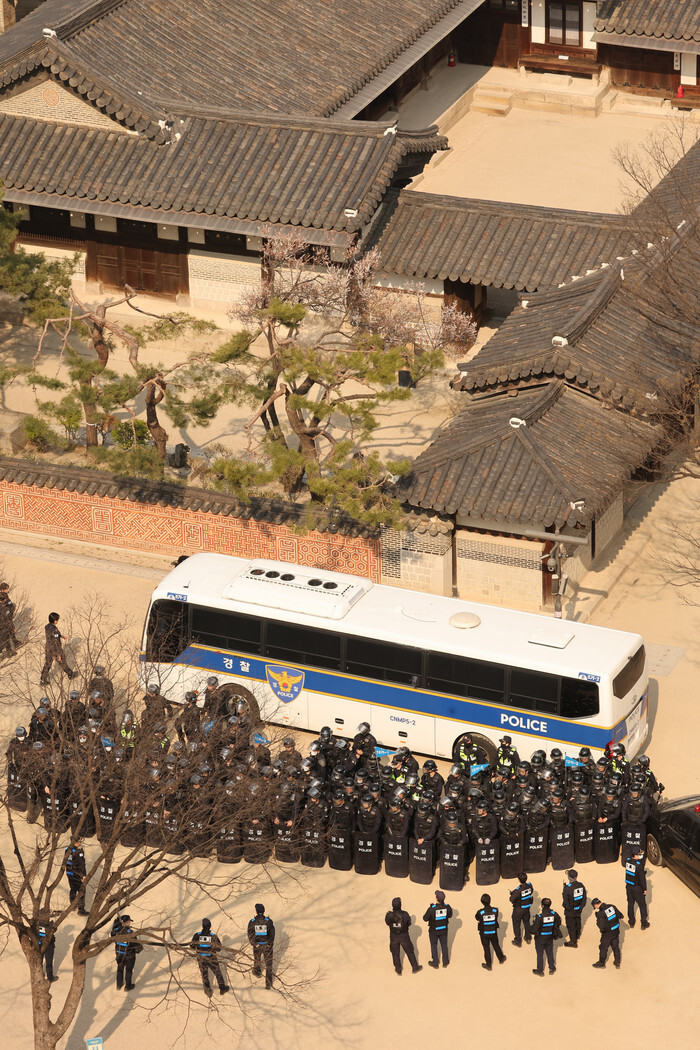 Riot police officers gather to train at Unhyeon Royal Residence from the 1392-1910 Joseon Dynasty near the Constitutional Court in Seoul on April 3, 2025, as police placed their forces on the second-highest alert one day before the court hands down a decision on whether to remove impeached President Yoon Suk Yeol from office or reinstate him over his brief imposition of martial law in early December. (Yonhap)