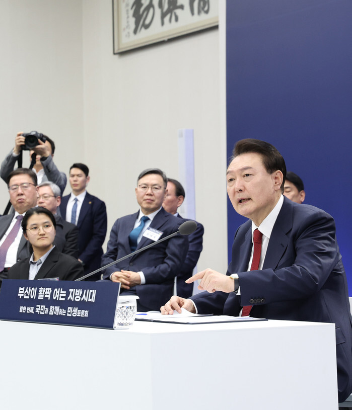 President Yoon Suk Yeol (R) speaks during a government-public debate to discuss ways to improve people's livelihoods through balanced regional development at City Hall in the southeastern port city of Busan on Feb. 13, 2024. (Yonhap)