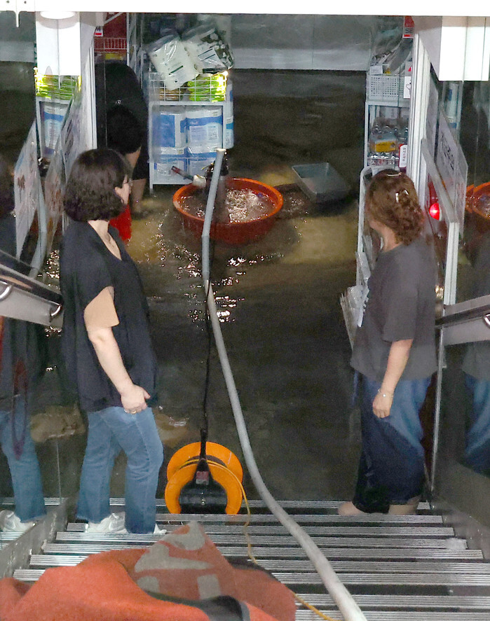 Shopkeepers drain their shop at a flooded market in Incheon, west of Seoul, on Aug. 13, 2025, following torrential rains that hit the greater Seoul area and some central parts of the country. (Yonhap)