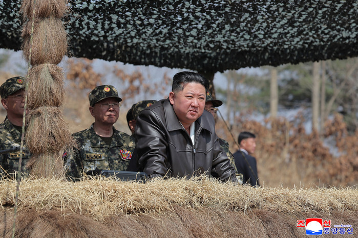 This photo, carried by North Korea's official Korean Central News Agency on April 5, 2025, shows the North's leader Kim Jong-un inspecting the training activities of special operations units the previous day. (For Use Only in the Republic of Korea. No Redistribution) (Yonhap)