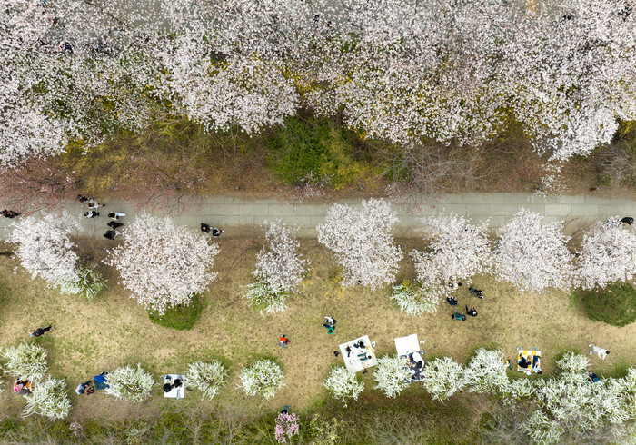 People take a stroll on a path in the Yeouido area of Seoul's Yeongdeungpo Ward, a famous spot for viewing cherry blossoms, on April 9, 2025, one day after the annual spring flower festival opened. (Yonhap)