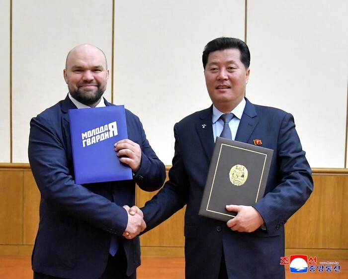 Mun Chol (R), chairman of North Korea's Socialist Patriotic Youth League's Central Committee, and Anton Zemidov, chairman of the Coordinating Council of the United Russia Youth Guards, pose for a photo during their meeting at the People's Palace of Culture in Pyongyang on April 15, 2025, in this photo released by the North's official Korean Central News Agency the next day. (For Use Only in the Republic of Korea. No Redistribution) (Yonhap)