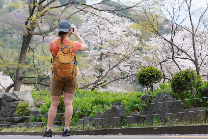 A visitor wearing light clothing photographs cherry blossoms on Mount Nam in Seoul on April 17, 2025, as South Korea experiences early summer weather, with the temperature climbing to an intraday high of 24 C in the South Korean capital. (Yonhap)