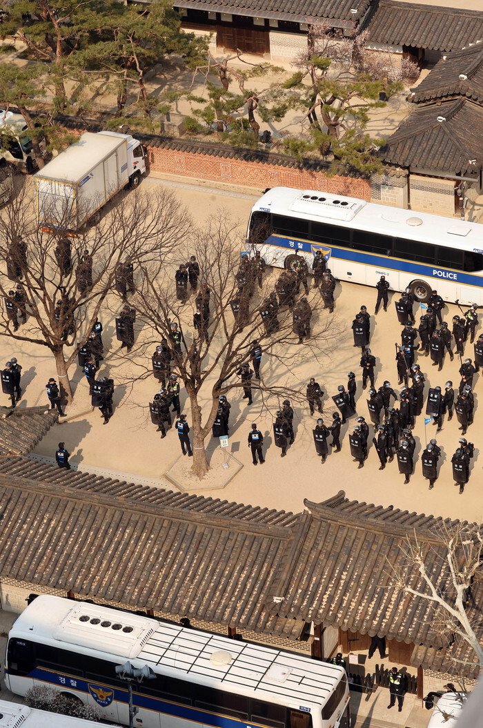 Riot police officers gather to train at Unhyeon Royal Residence from the 1392-1910 Joseon Dynasty near the Constitutional Court in Seoul on April 3, 2025, as police placed their forces on the second-highest alert one day before the court hands down a decision on whether to remove impeached President Yoon Suk Yeol from office or reinstate him over his brief imposition of martial law in early December. (Yonhap)