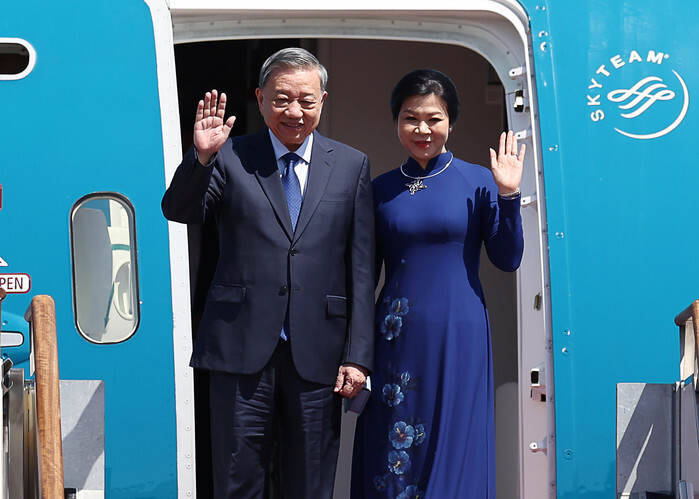 Vietnam's top leader, To Lam (L), and his wife, Ngo Phuong Ly, wave to a welcome delegation upon arriving at Seoul Air Base in Seongnam, south of Seoul, as Lam embarks on a state visit at the invitation of President Lee Jae Myung. Lam and Lee are scheduled to hold summit talks Monday. (Yonhap)