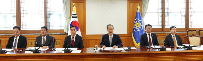 Acting President Han Duck-soo (4th from L), who concurrently serves as prime minister, speaks during a National Security Council meeting at the government complex in Seoul on April 4, 2025. Han called on top security officials to maintain a "watertight readiness posture" against possible provocations or propaganda by North Korea following the ouster of former President Yoon Suk Yeol. (Pool photo) (Yonhap)
