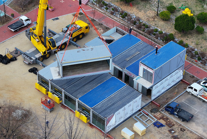 Housing for those who are displaced by wildfires is constructed in Andong, North Gyeongsang Province, southeastern South Korea, on March 31, 2025. (Yonhap)
