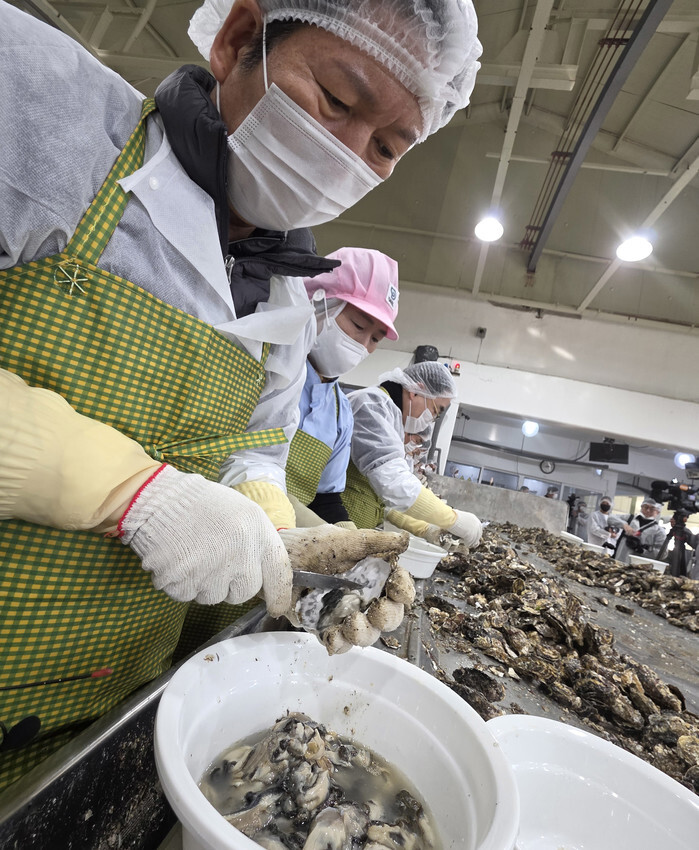 Jung Chung-rae, leader of the ruling Democratic Party, engages in voluntary work at a facility for shelling oysters in Geoje, South Gyeongsang Province, southeastern South Korea, on Jan. 9, 2026. (Yonhap)