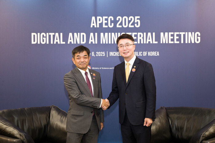 South Korea's Vice Science and ICT Minister Ryu Je-myung (R) poses for a photo with Japan's Vice Internal Affairs and Communications Minister Takuo Imagawa at the Songdo Convensia convention center in Incheon, west of Seoul, on Aug. 4, 2025, on the sidelines of a meeting of digital and artificial intelligence ministers from 21 Asia-Pacific Economic Cooperation forum member economies, in this photo released by the science ministry. (PHOTO NOT FOR SALE) (Yonhap)