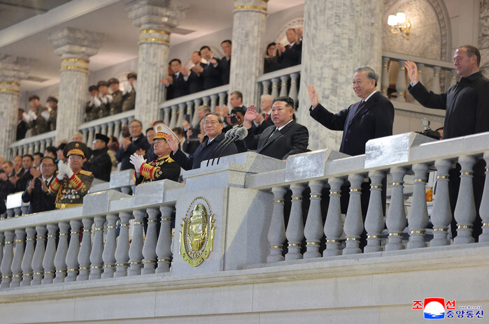 North Korean leader Kim Jong-un (3rd from R) waves as he observes a military parade at Kim Il Sung Square in Pyongyang on Oct. 10, 2025, to mark the 80th anniversary of the founding of the country's ruling Workers' Party of Korea, in this photo released by the North's official Korean Central News Agency the next day. (For Use Only in the Republic of Korea. No Redistribution) (Yonhap)