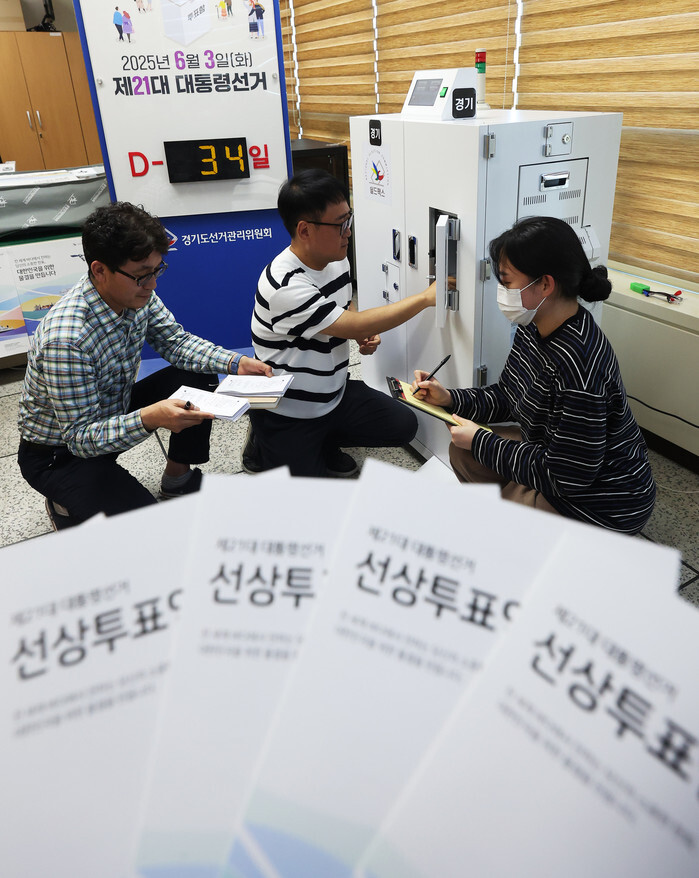 Employees check a machine that will be used to seal and print the ballots cast by sailors and fishermen at sea for the June 3 presidential election at an office of the National Election Commission in Suwon, south of Seoul, on April 30, 2025, with 34 days left until the election. (Yonhap)