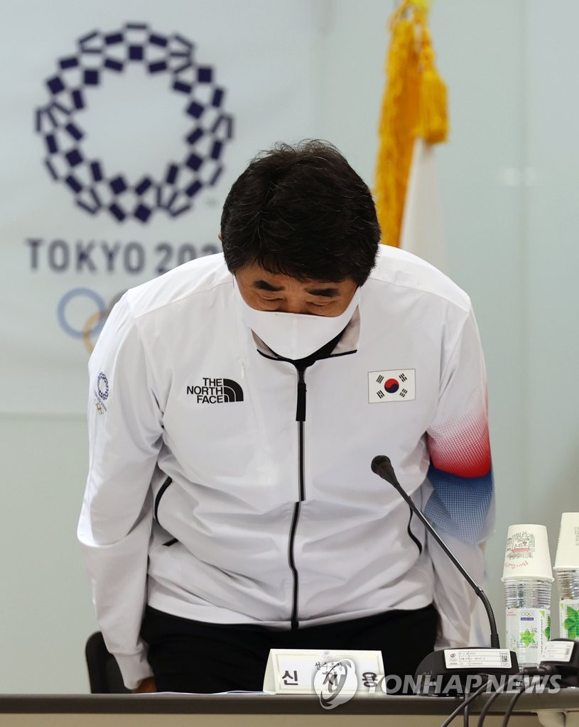| ▲ Shin Chi-yong, head of the Jincheon National Training Center, takes a bow before the start of a press conference at the Olympic training facility in Jincheon, 90 kilometers south of Seoul, on June 28, 2021. (Yonhap) |