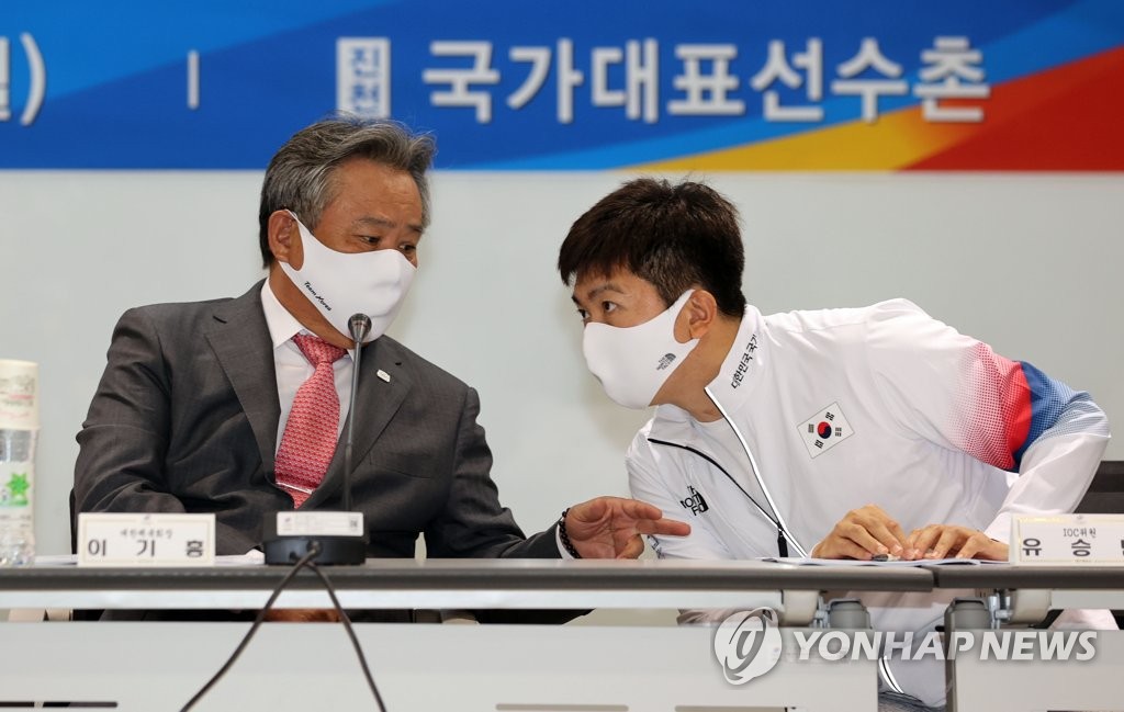 | ▲ Lee Kee-heung (L), president of the Korean Sport & Olympic Committee, and Ryu Seung-min, a member of the International Olympic Committee, speak during a press conference at the Jincheon National Training Center in Jincheon, 90 kilometers south of Seoul, on June 28, 2021. (Yonhap) |