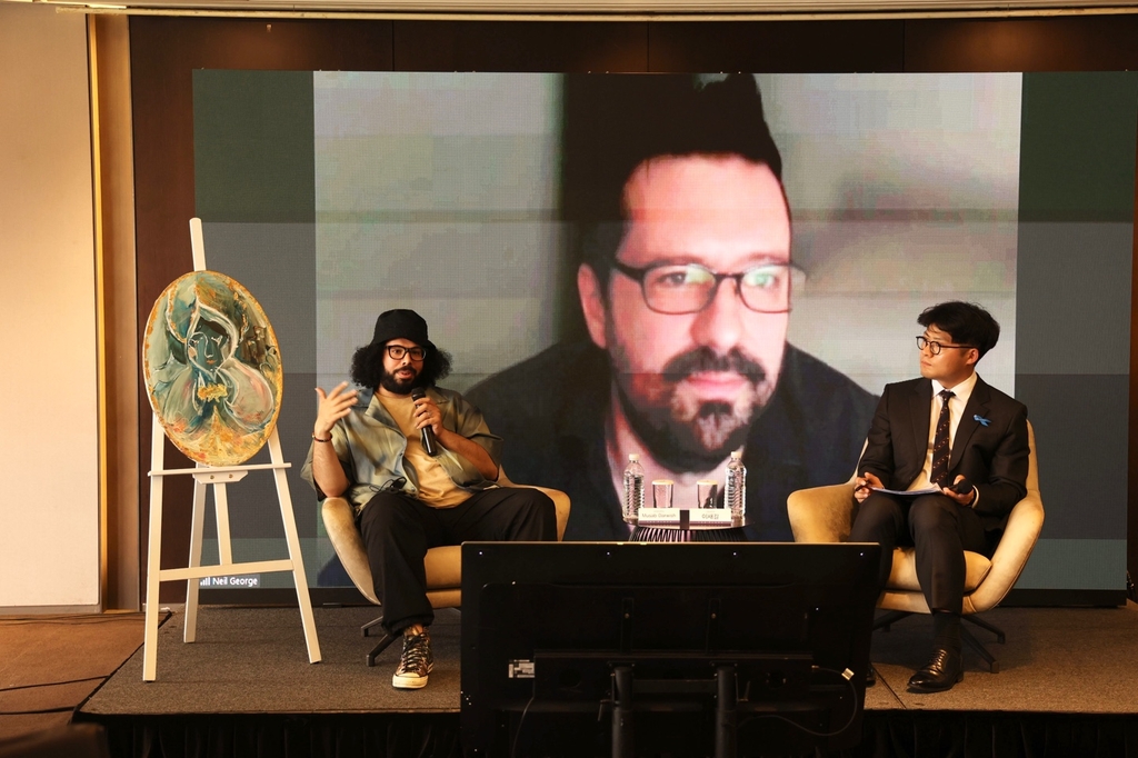 | ▲ '제2회 유엔난민기구 온라인 영화제' 기념 상영회 9일 서울 중구 더 플라자 호텔에서 열린 '제2회 유엔난민기구 온라인 영화제' 기념 상영회에서 참석자들이 대화를 나누고 있다. 난민 다큐멘터리 영화 '도도무'의 무삽 다르위스 조감독(왼쪽)과 이새길 유엔난민기구 공보지원담당관. 가운데는 두바이에서 화상으로 참여한 '도도무'의 닐 조지 감독. [유엔난민기구 제공. 재판매 및 DB 금지] |