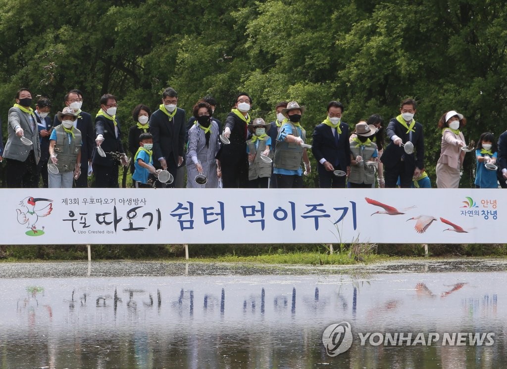 | ▲ This photo shows people at Changnyeong county feeding the crested ibises on May 6th. (Changnyeong=Yonhap News) |