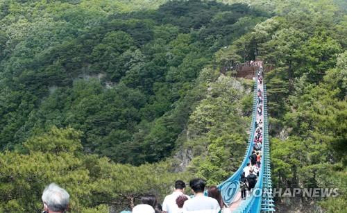 | ▲ 신록이 우거진 원주 출렁다리 (원주=연합뉴스) 이재현 기자 = 전국적인 명소로 자리매김한 강원 원주 간현관광지 내 소금산 출렁다리에 7일 많은 인파가 찾아와 신록을 만끽하고 있다. 2022.5.7 jlee@yna.co.kr |