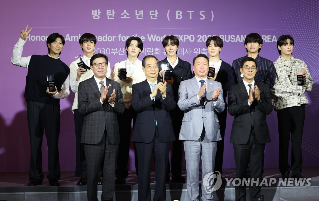 | ▲ '부산엑스포를 위해!' (서울=연합뉴스) 김승두 기자 = 한덕수 국무총리가 19일 서울 용산구 ㈜하이브에서 그룹 방탄소년단(BTS)에게 부산엑스포 홍보대사 위촉장을 수여한 뒤 참석자들과 기념촬영을 하고 있다. 2022.7.19 kimsdoo@yna.co.kr |