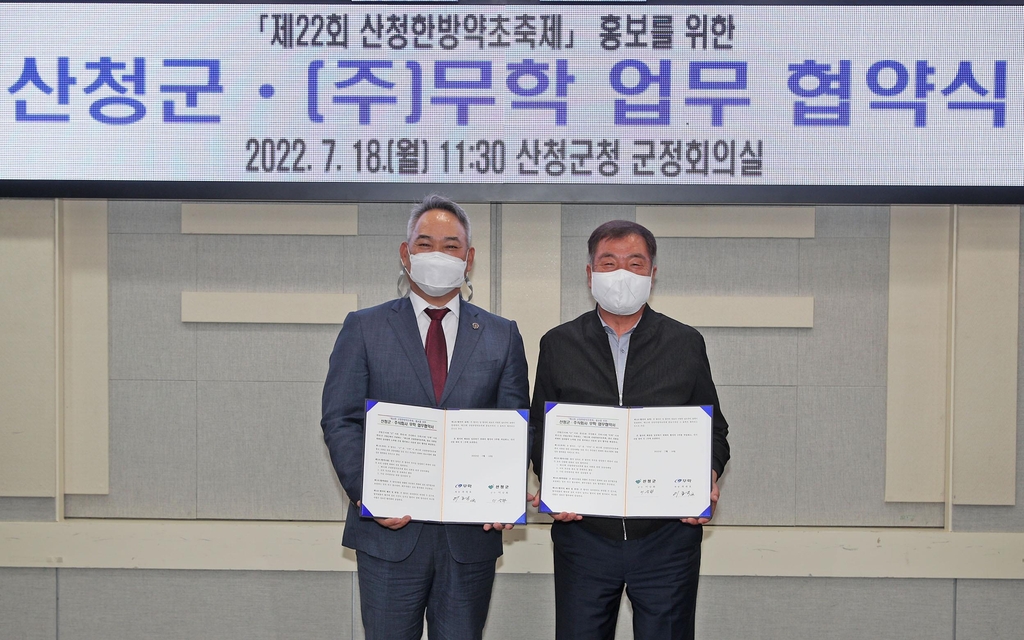 이승화 산청군수와 이종수 무학 사장은 18일 산청군청에서 제22회 산청한방약초축제 홍보를 위한 업무협약을 했다.