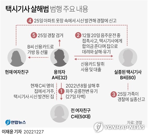 | ▲ [그래픽] 택시기사 살해범 주요 범행 (서울=연합뉴스) 이재윤 기자 = 택시 기사를 살해하고 옷장에 시신을 숨겼다가 검거된 30대 남성이 전 여자친구도 살해한 사실을 자백했다. 27일 경기 일산동부경찰서 등에 따르면 살인 및 사체은닉 등의 혐의로 구속영장이 신청된 A(32)씨는 전 여자친구이자 동거인이었던 50대 여성 B씨 살해 혐의에 대해 추가로 자백했다. yoon2@yna.co.kr 트위터 @yonhap_graphics 페이스북 tuney.kr/LeYN1 |