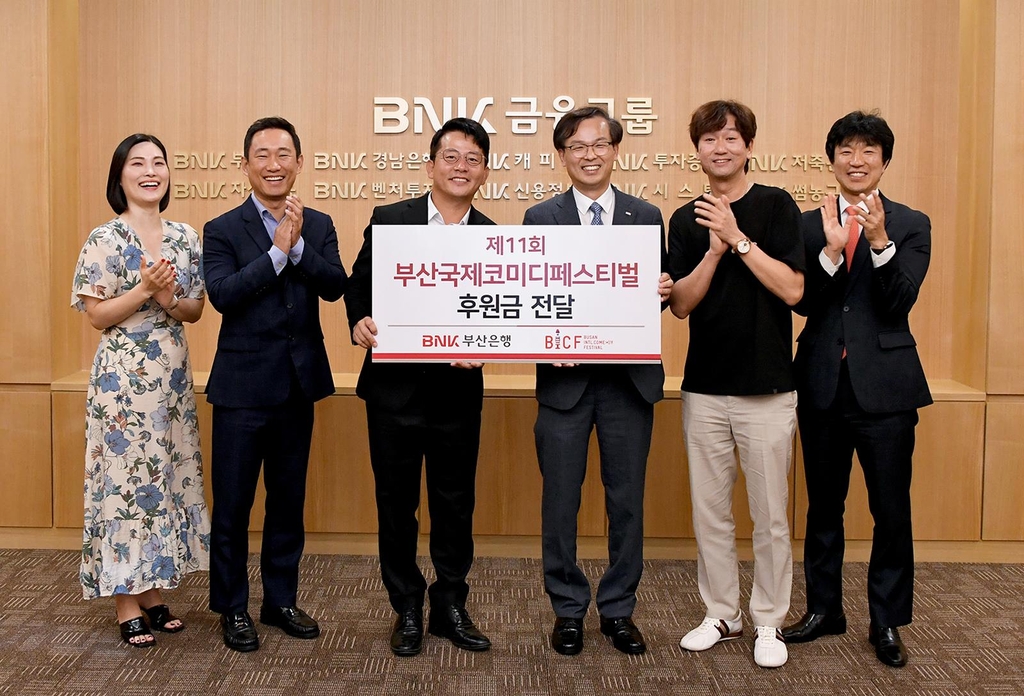 ▲ BNK부산은행은 7일 제11회 부산국제코미디페스티벌의 성공적 개최를 위해 후원금 5천만원을 부산국제코미디페스티벌 조직위원회에 전달했다고 밝혔다. 올해로 11회를 맞은 부산국제코미디페스티벌은 코미디 문화 콘텐츠 개발과 한국 코미디 산업의 활성화를 위해 2013년부터 매년 개최되는 아시아 최초의 코미디 페스티벌이다. 부산은행은 부산국제코미디페스티벌의 발전을 위해 제1회부터 후원하고 있다. (부산=연합뉴스)