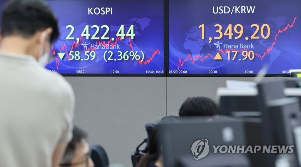 SEOUL, Aug. 29 (Yonhap) -- The South Korean currency on Monday sank below the 1,350 level against the U.S. dollar for the first time in more than 13 years as the Federal Reserve's hawkish monetary policy stance boosted demand for the greenback.