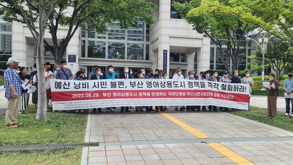 이에 대해 한글문화연대 등 76개 한글 관련 단체와 부산 작가회의 등 지역 34개 시민단체는 '부산 영어 상용도시 정책 반대 국민연합'을 결성해 이날 부산시청 앞에서 기자회견을 하고 영어 상용도시 정책 철회를 촉구했다.