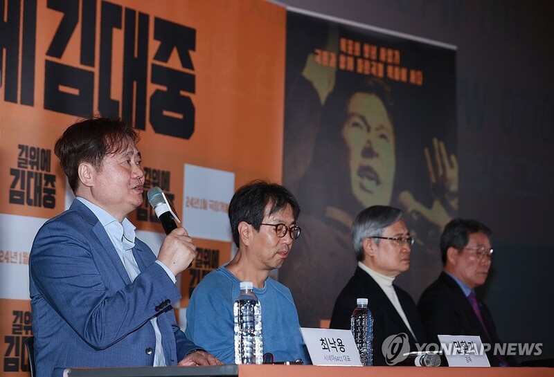 | ▲ 김대중 전 대통령 탄생 100주년 다큐 영화 기자회견 (서울=연합뉴스) 진연수 기자 = 11일 서울 용산구 CGV용산아이파크몰에서 열린 김대중 전 대통령의 일대기를 그린 다큐멘터리 영화 '길위에 김대중' 기자회견에서 최낙용 시네마6411 대표가 질문에 답하고 있다. 2023.11.1 jin90@yna.co.kr |