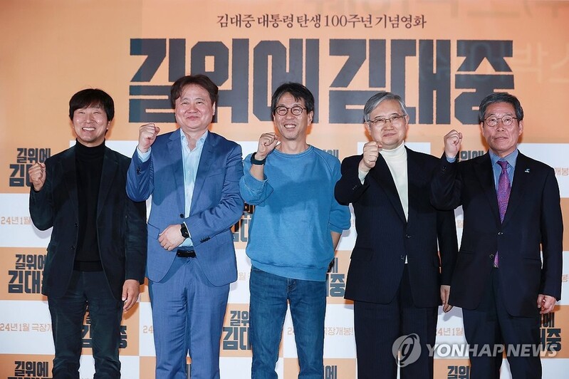 | ▲ 다큐멘터리 영화 '길위에 김대중' 관계자들 (서울=연합뉴스) 진연수 기자 = 11일 서울 용산구 CGV용산아이파크몰에서 열린 김대중 전 대통령의 일대기를 그린 다큐멘터리 영화 '길위에 김대중' 기자회견에서 참석자들이 포즈를 취하고 있다. 왼쪽부터 이은 명필름 대표, 최낙용 시네마6411 대표, 민환기 감독, 김성재 김대중평화센터 상임이사, 정진백 집행위원장. 2023.11.1 jin90@yna.co.kr |