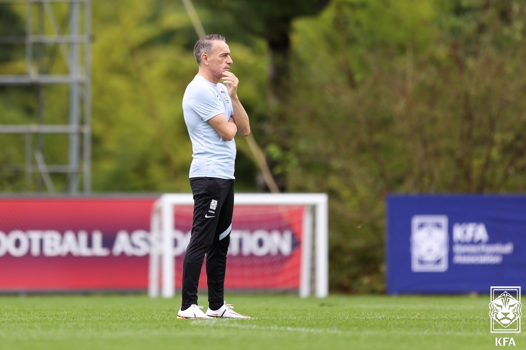 ▲ Paulo Bento, head coach of the South Korean men's national football team, watches his players during practice at the National Football Center in Paju, Gyeonggi Province, on Sept. 1, 2021, ahead of a World Cup qualifier against Iraq, in this photo provided by the Korea Football Association. (PHOTO NOT FOR SALE) (Yonhap)
