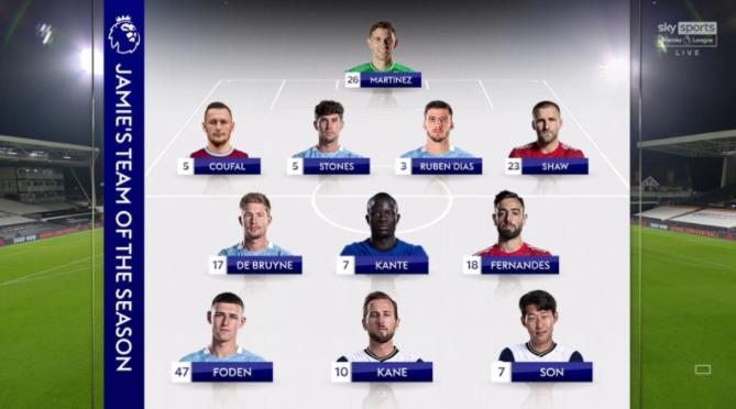 캐러거는 스리톱 공격진에 필 포든(맨체스터 시티, 이하 맨시티)-해리 케인(토트넘)-손흥민을 선정한 가운데 2선 공격진으로 케빈 더브라위너(멘시티)-응골로 캉테(첼시)-브루노 페르난데스(맨체스터 유나이티드, 이하 맨유)를 뽑았다.