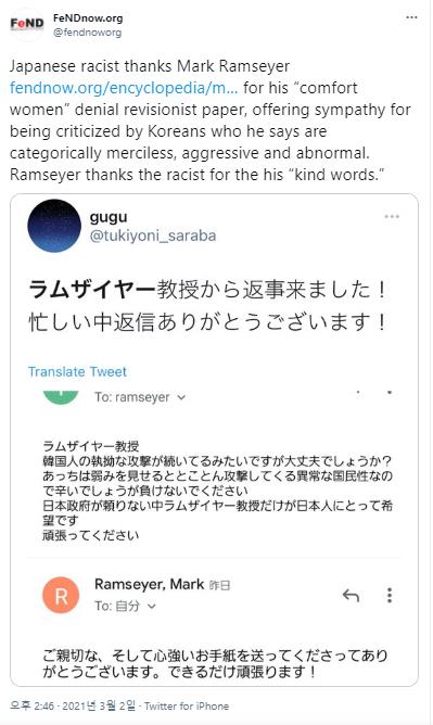 탈식민지화를 위한 미일 페미니스트 네트워크(FeND)도 문제의 트윗을 캡처해 "일본의 인종차별주의자가 램지어 교수에게 위안부를 부정하는 수정주의 논문에 대해 감사해했다"며 "램지어도 이 인종차별주의자에게 '친절한 편지'에 감사를 표했다"고 전했다.