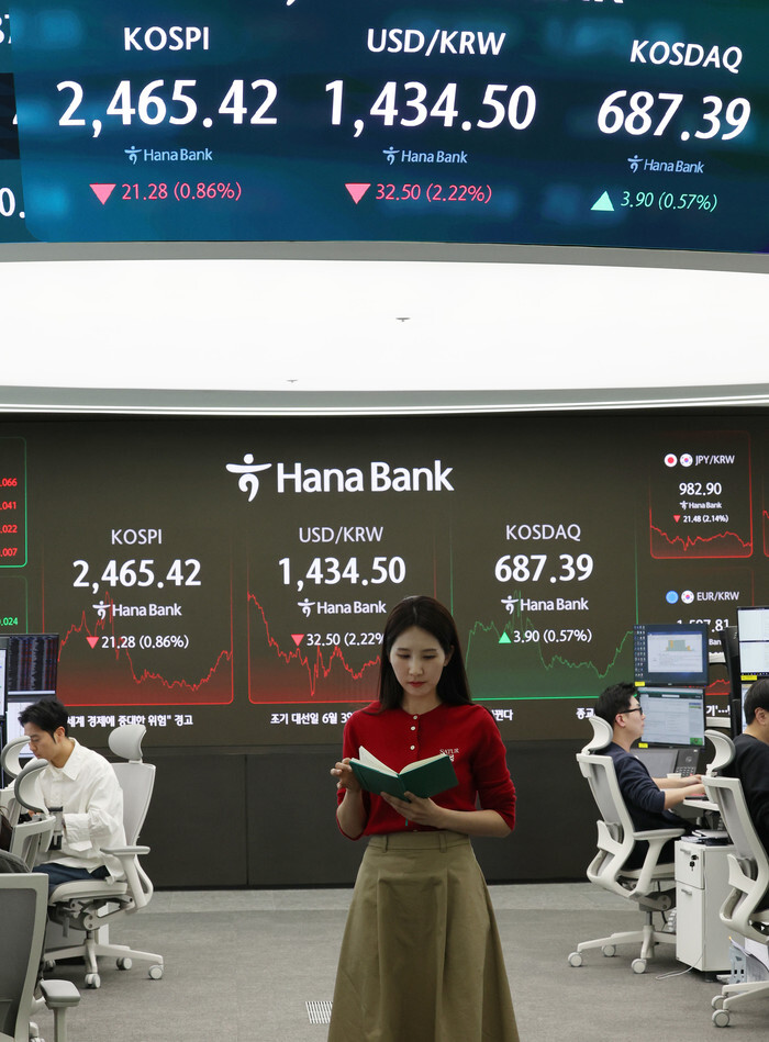 An electronic signboard in the dealing room of Hana Bank in Seoul on April 4, 2025, shows the benchmark Korea Composite Stock Price Index having fallen 21.28 points, or 0.86 percent, to close at 2,465.42. South Korean stocks closed lower amid the Constitutional Court's historic ruling to oust President Yoon Suk Yeol and rising concerns over looming tariff wars. (Yonhap)
