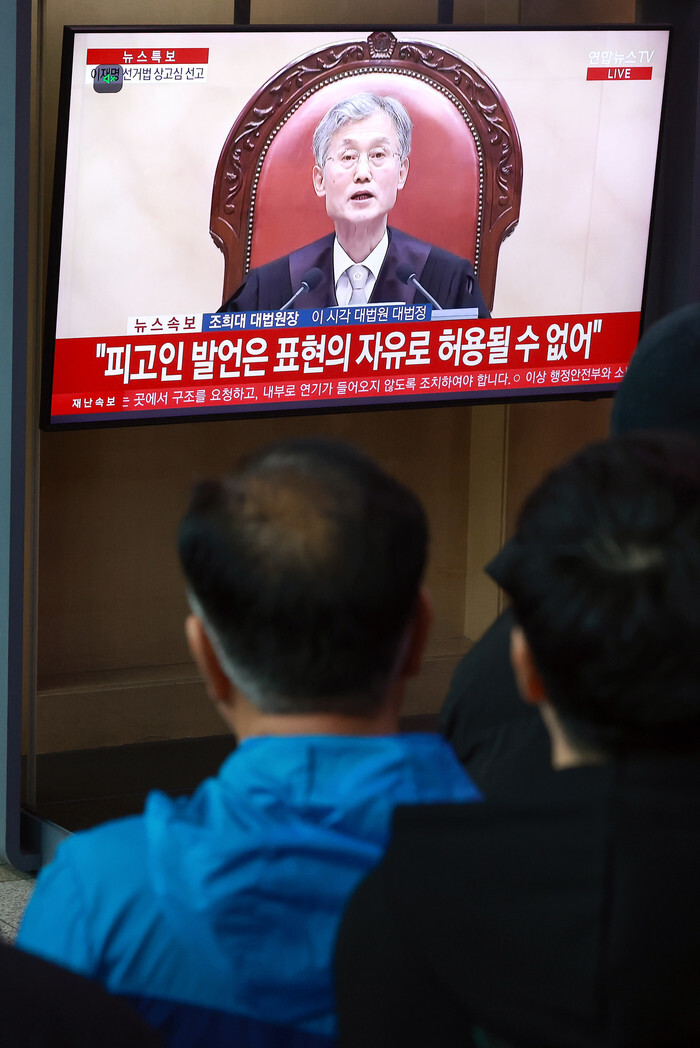People watch a live TV broadcast at Seoul Station in the capital on May 1, 2025, about the Supreme Court's hearing to hand down a ruling on the election law violation case of the Democratic Party presidential candidate Lee Jae-myung. The court ordered the high court to reexamine Lee's acquittal on charges of election law violation. (Yonhap)