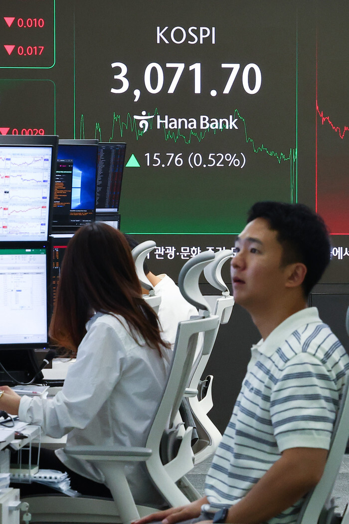 A financial data screen in the dealing room of Hana Bank in Seoul on June 30, 2025, shows the benchmark Korea Composite Stock Price Index having gained 15.76 points, or 0.52 percent, to close at 3,071.70. South Korean stocks finished modestly higher, led by gains in chemical shares, as investors welcomed signs of progress in Sino-U.S. trade talks and looked to developments in tariff negotiations between South Korea and the United States. (Yonhap)