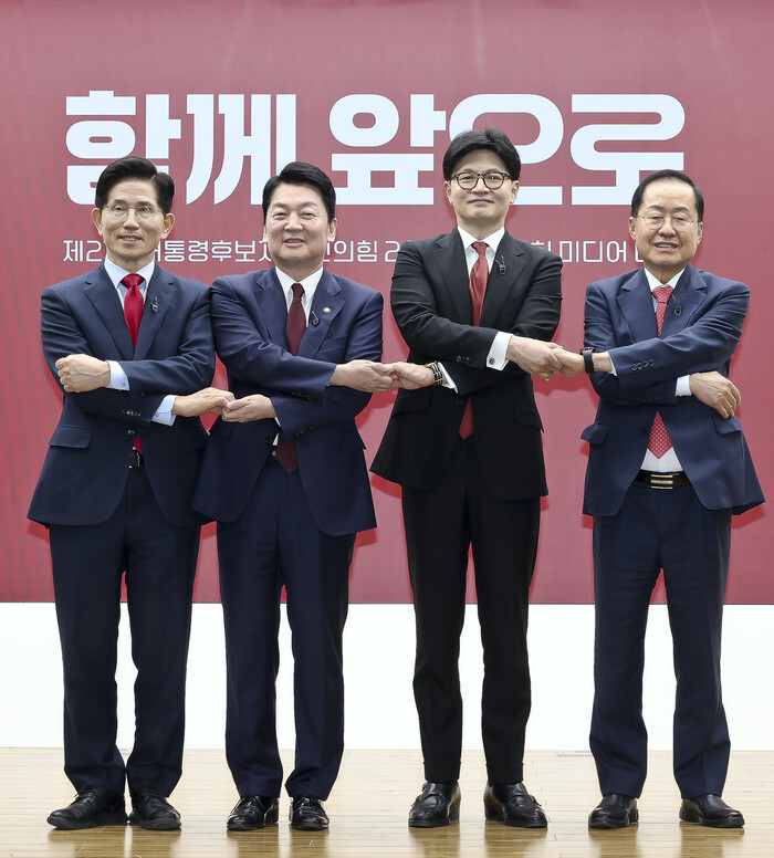 Four candidates in the conservative People Power Party's (PPP) primary to choose its flag bearer for the June 3 presidential election -- (from L to R) former Labor Minister Kim Moon-soo, lawmaker Ahn Cheol-soo, former PPP leader Han Dong-hoon and former Daegu Mayor Hong Joon-pyo -- pose for a photo during a media day event ahead of their second debate. (Yonhap)