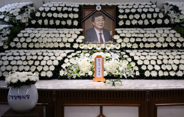A portrait and mortuary tablet of former lawmaker Kim Hong-up, second son of former President Kim Dae-jung, are displayed for his funeral at Severance Hospital in Seoul on Sept. 24, 2025. The younger Kim died at age 75 earlier in the day. (Yonhap)