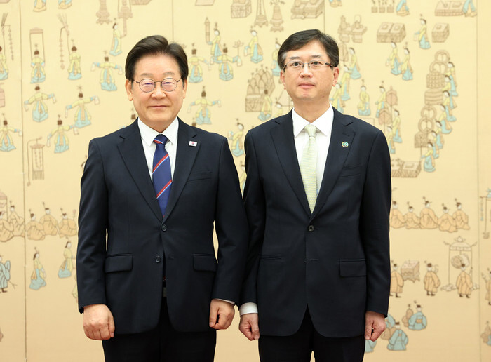 President Lee Jae Myung (L) poses for a photo with Oh Young-joon, a justice of the Constitutional Court, after presenting him with a letter of appointment at the presidential office in Seoul on July 28, 2025. (Pool photo) (Yonhap)