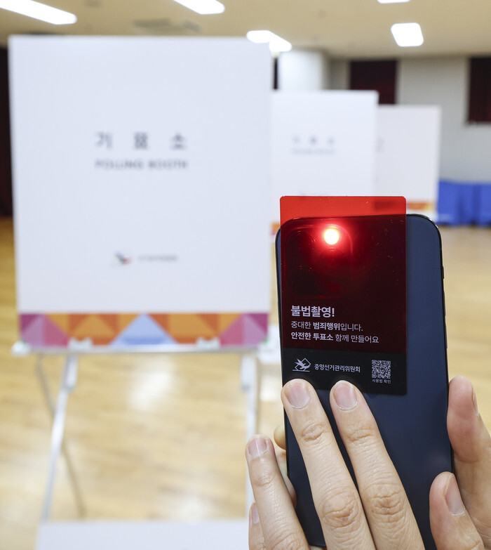 An election official checks a machine at a polling station in Seoul on June 2, 2025, to detect any hidden cameras that might have been installed on the eve of the presidential election. (Yonhap)
