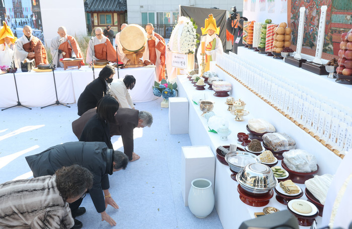Bereaved families give a deep bow at Jogye Temple in Seoul on Nov. 18, 2025, during a Buddhist ritual to hold a memorial service for victims of industrial accidents. (Yonhap)