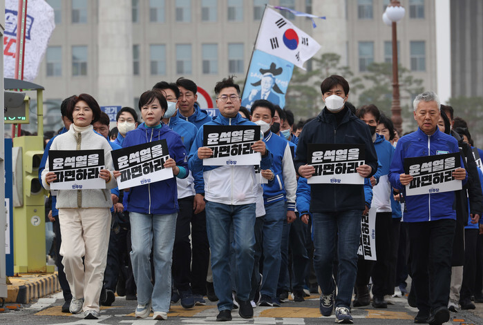 Lawmakers of the main opposition Democratic Party march from the National Assembly in western Seoul on March 25, 2025, toward Gwanghwamun Square in the capital's downtown as part of efforts to call for impeached President Yoon Suk Yeol's removal from office. (Yonhap)