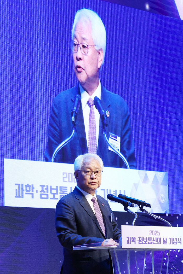 Lee Tai-sik, chairman of the Korean Federation of Science and Technology Societies, speaks during a ceremony in Seoul on April 21, 2025, to celebrate this year's Science, Information and Communication Day. (Pool photo) (Yonhap)