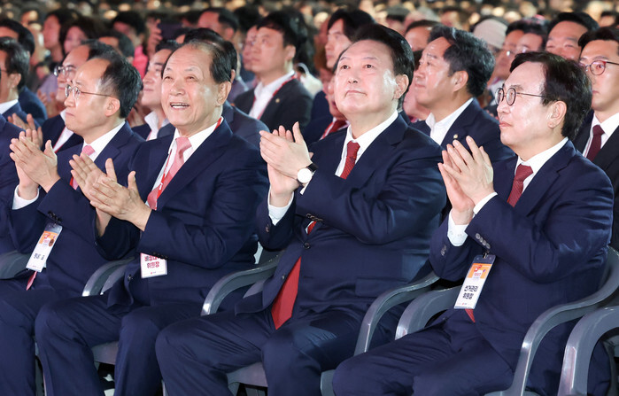 President Yoon Suk Yeol (2nd from R) claps during a national convention of the ruling People Power Party to elect the party's new leader at a convention center in Goyang, north of Seoul, on July 23, 2024. (Pool photo) (Yonhap)
