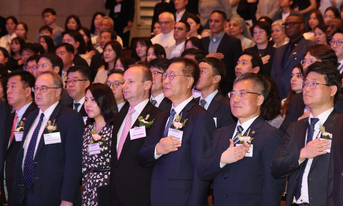 Justice Minister Park Sung-jae (3rd from R) salutes the national flag at a ceremony to mark the 18th anniversary of Together Day in Gwacheon, south of Seoul, on May 20, 2025, a day that South Korea designated in 2007 to promote the creation of a harmonious and cooperative multicultural society in the country. (Yonhap)