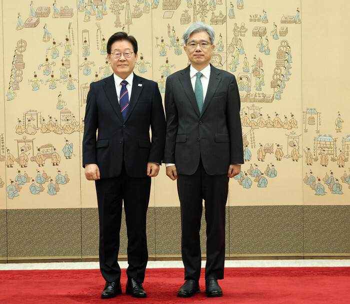 President Lee Jae Myung (L) poses for a photo with Kim Sang-hwan, chief justice of the Constitutional Court, after presenting him with a letter of appointment at the presidential office in Seoul on July 28, 2025. (Pool photo) (Yonhap)