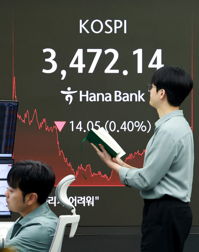 A financial data screen in the dealing room of Hana Bank in Seoul on Sept. 24, 2025, shows the benchmark Korea Composite Stock Price Index having fallen 14.05 points, or 0.40 percent, to close at 3,472.14. South Korean stocks closed lower after hitting a new high as investors cashed in profits and digested the U.S. Federal Reserve chair's comment that stock prices are overvalued. (Yonhap)