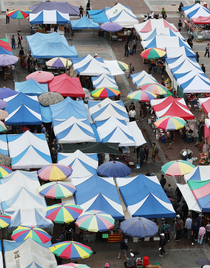 Shoppers visit the stalls of Moran Market, with each tent and umbrella being an individual merchant stand, in the city of Seongnam, south of Seoul, on Sept. 24, 2025, to buy food and offerings for traditional Korean rituals ahead of the Chuseok holiday, which is one of the two major Korean traditional holidays and falls on Oct. 6 this year, forming part of a seven-day break. Moran Market is the largest traditional five-day market in South Korea. (Yonhap)