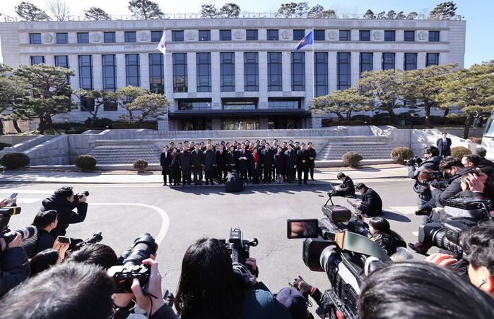 Lawmakers of the ruling People Power Party hold an interview in front of the Constitutional Court in central Seoul on Feb. 17, 2025, to call for a fair impeachment trial for President Yoon Suk Yeol. (Pool photo) (Yonhap)