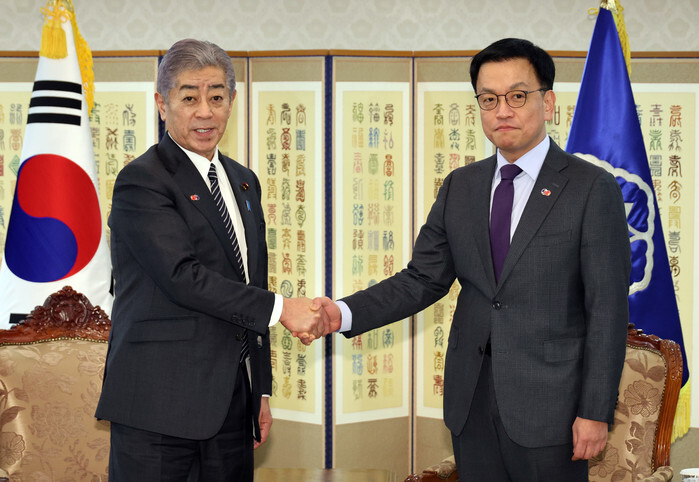 Acting President Choi Sang-mok (R), who concurrently serves as deputy prime minister for economic affairs and finance minister, poses for a photo with Japanese Foreign Minister Takeshi Iwaya during their meeting at the government complex in Seoul on Jan. 14, 2025. (Yonhap)