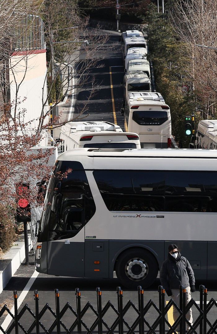 A bus blocks a road leading to the entrance of impeached President Yoon Suk Yeol's official residence in Seoul on Jan. 9, 2025, as investigators led by the Corruption Investigation Office for High-ranking Officials are expected to execute a warrant for the second time to detain Yoon over his short-lived imposition of martial law. (Yonhap)