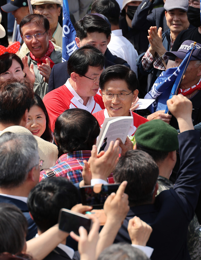 Kim Moon-soo (C), the presidential candidate of the conservative People Power Party, is surrounded by voters during a campaign stop at an express bus terminal in Seoul on May 20, 2025, ahead of the June 3 presidential election. (Yonhap)